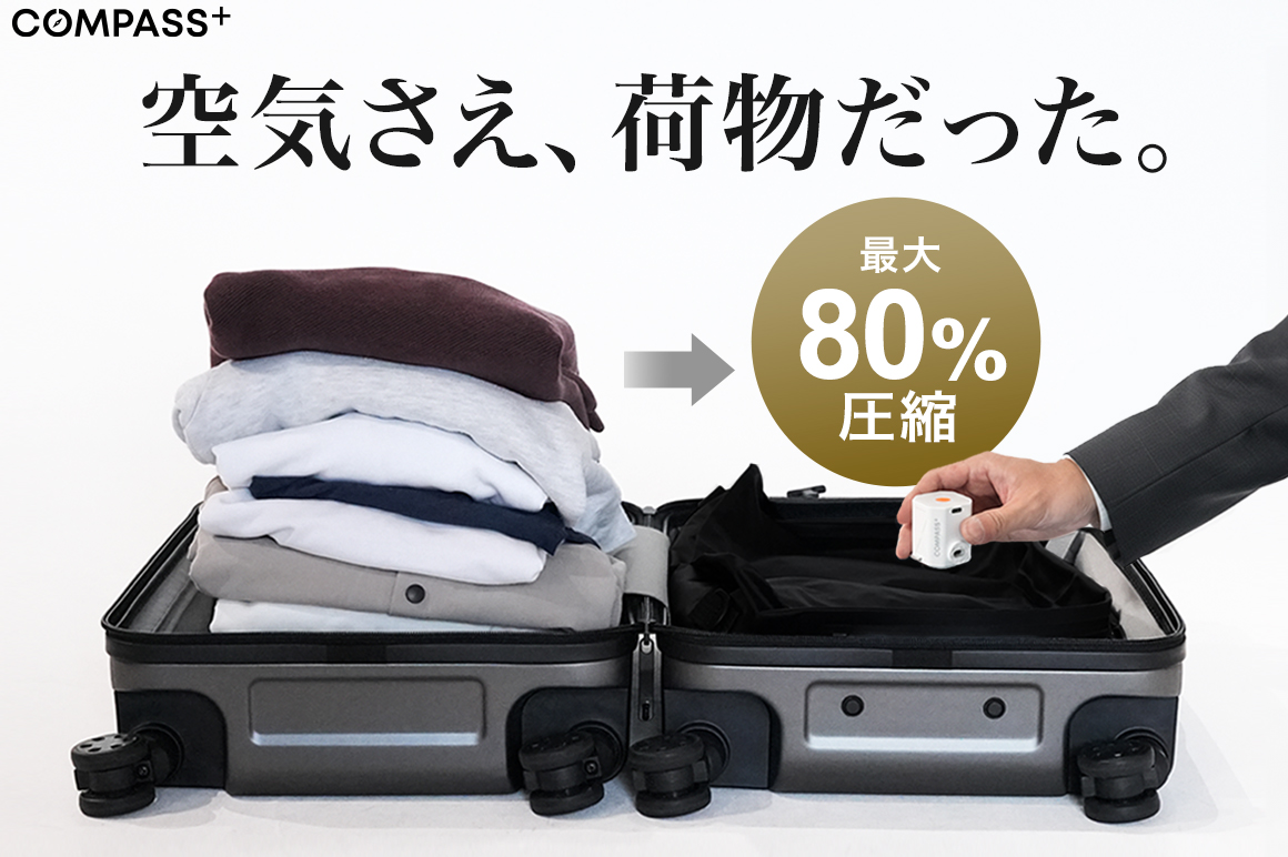 45gの超小型ポンプで旅のパッキングを劇的に変える。 高気密・高耐久な多機能圧縮バッグ 「COMPASS+」エアロコンプレッションキューブ