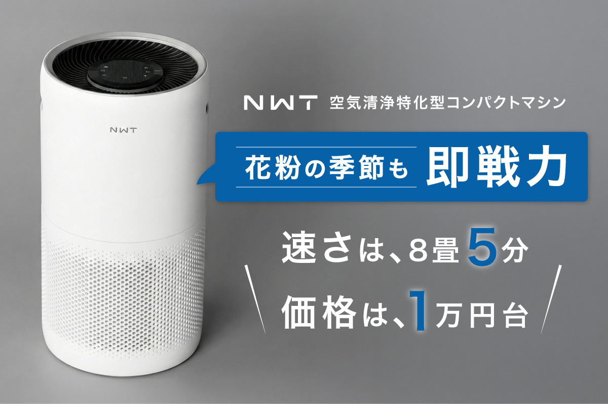 8畳わずか5分の空気清浄。台湾45年の空気技術を、1万円台で。 花粉の約1/100サイズまで捕集する『NWT空気清浄特化型コンパクトマシン』 【最新型HEPA13 × 360°全方位吸引】