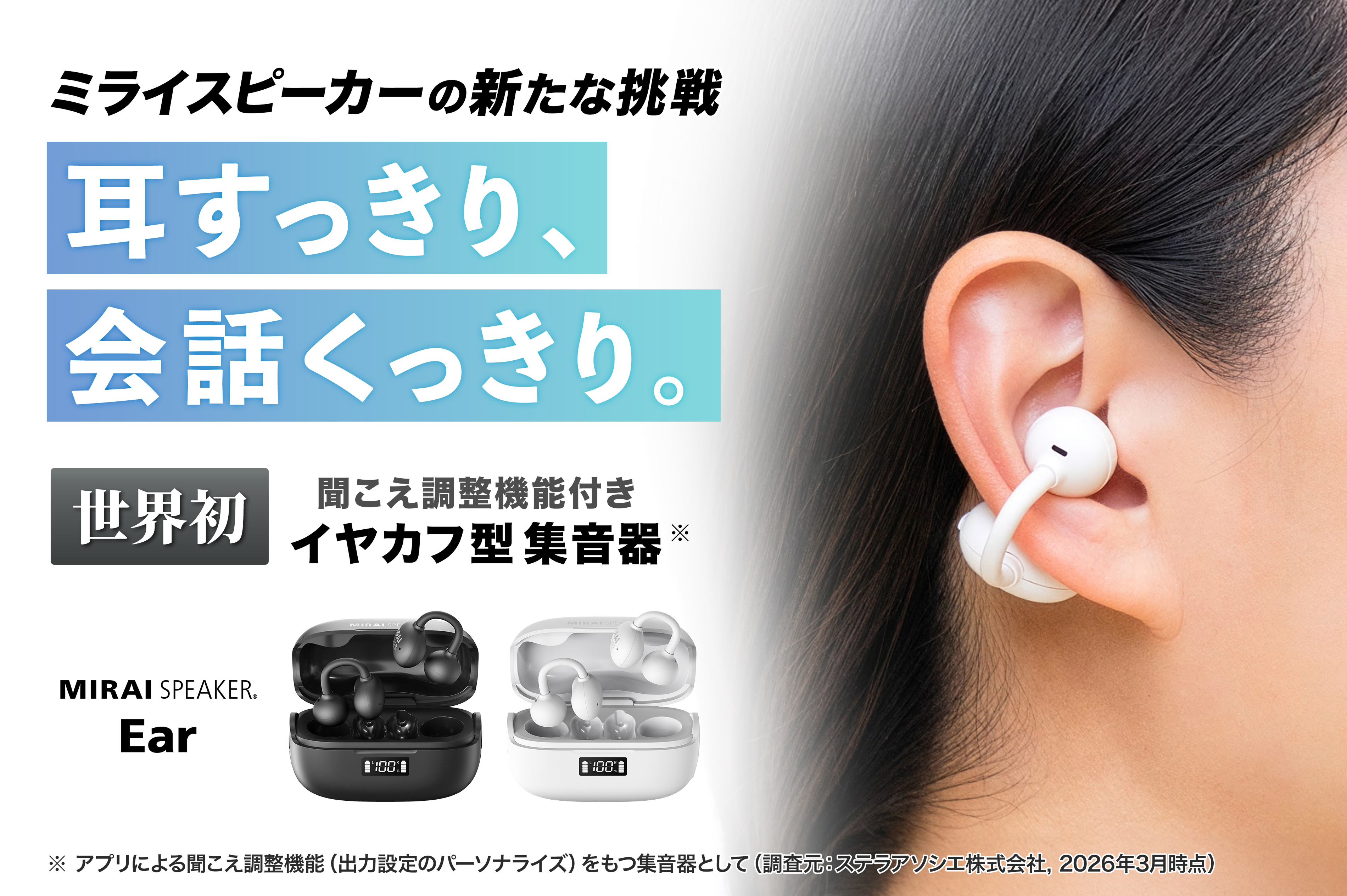 【世界初】「耳すっきり、会話くっきり」で世界が変わる。つけていることを忘れてしまう片耳わずか5.6gの聞こえ調整機能付きイヤカフ型集音器〜ミライスピーカーの挑戦〜「MIRAI SPEAKER Ear」