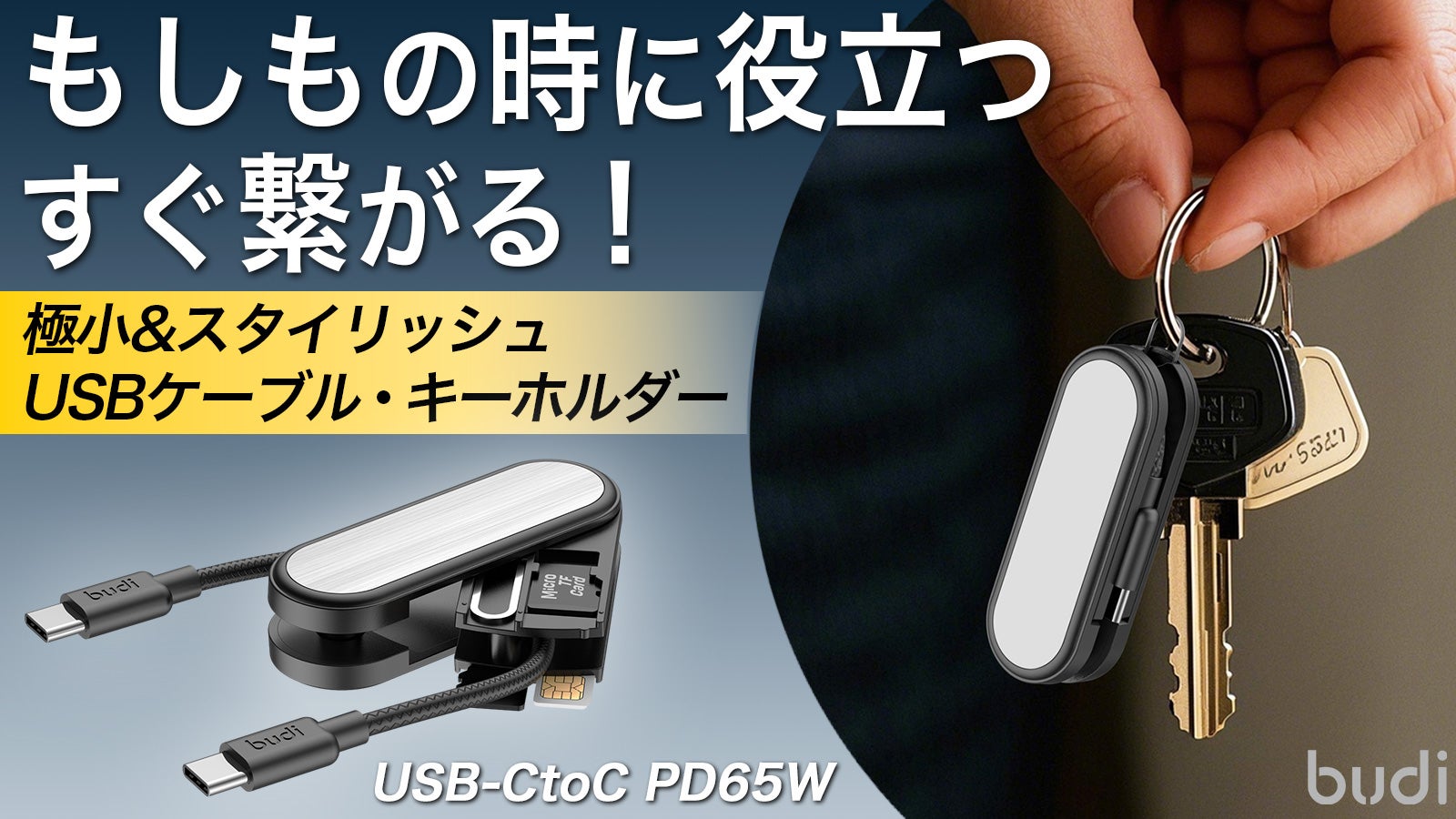小さくスタイリッシュなキーホルダーがUSB-Cケーブル、データカード収納に変形!