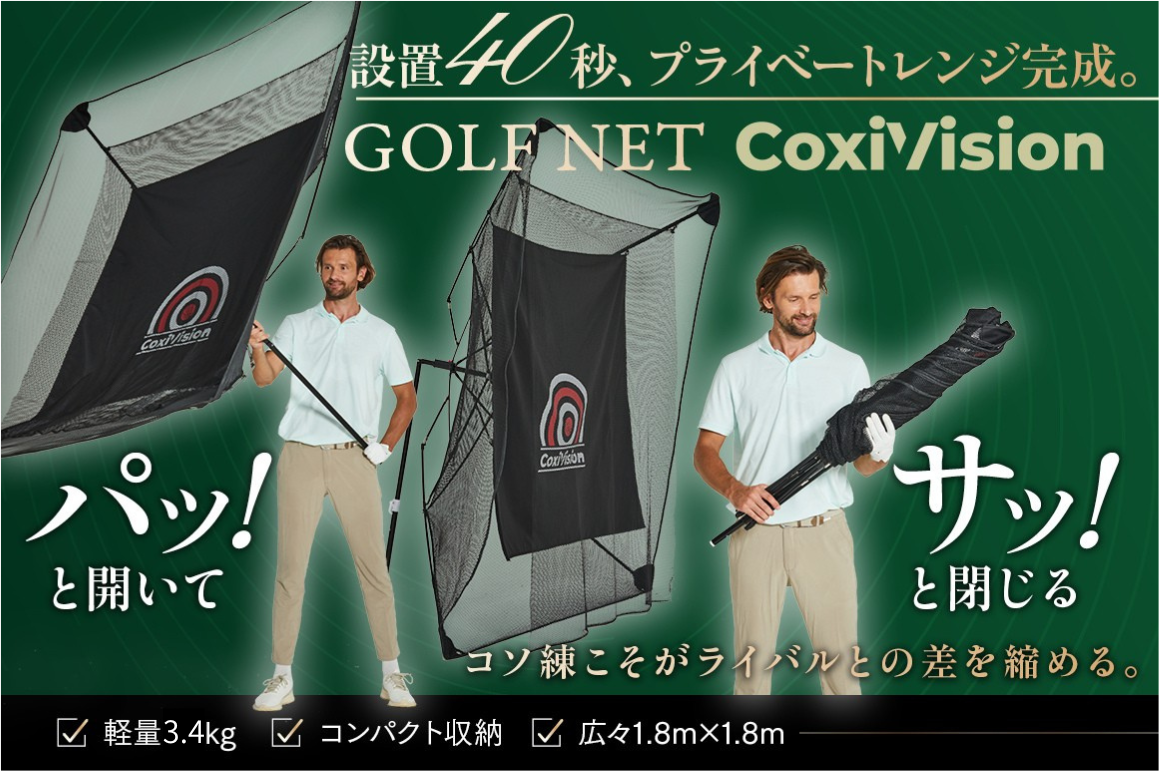 自宅のお庭やガレージ、リビングでも簡単に設置が可能。傘のように開閉できる折りたたみ式ゴルフネット(特許申請中)。練習後はスマート収納。